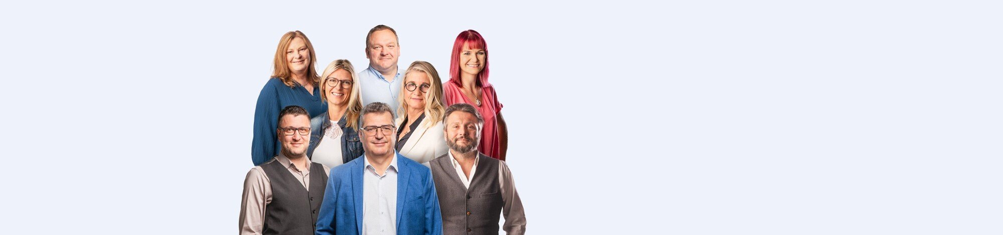 Das Team der UNIQA GeneralAgentur Mitterbauer vor blauem Hintergrund.